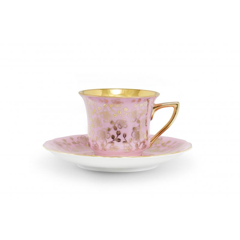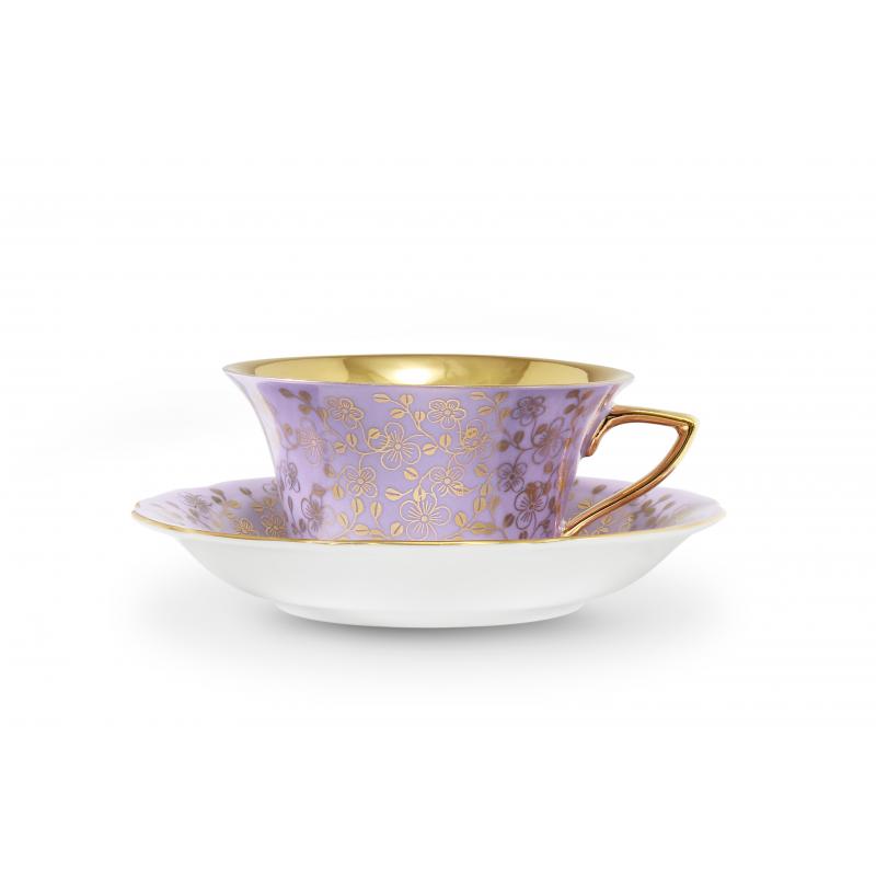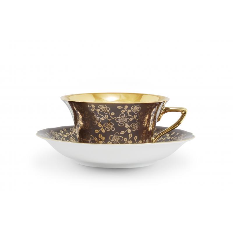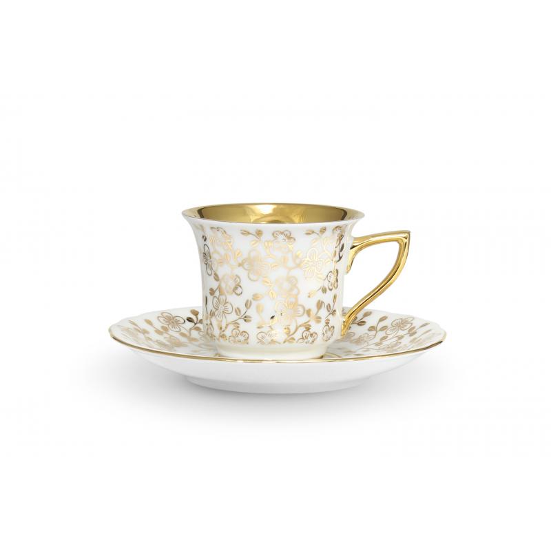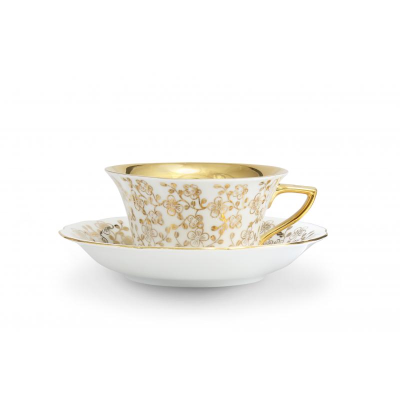 Celozlacený vnitřek šálku a zlatá razítka s velkými květy v kombinaci s pastelovými barvami dávají soupravě neobyčejný vzhled.