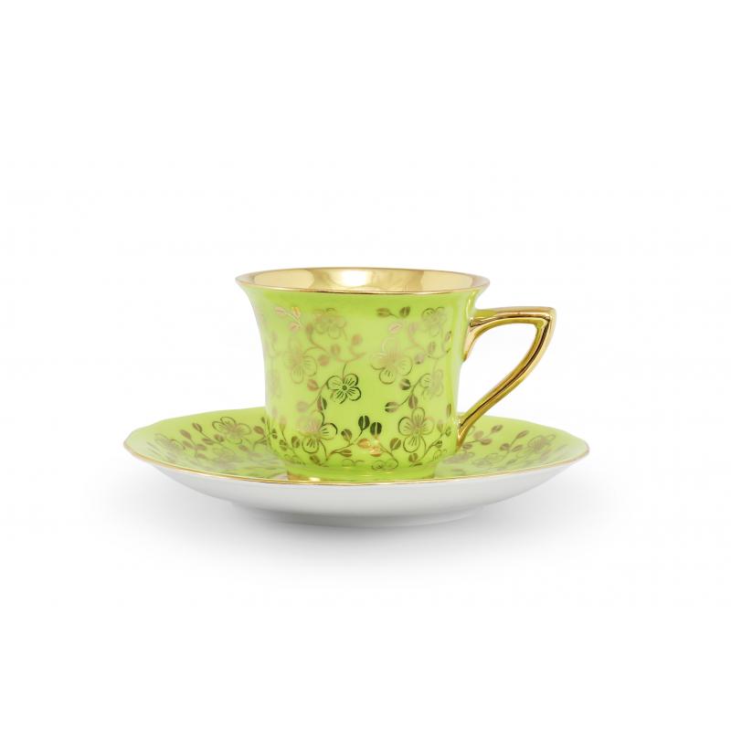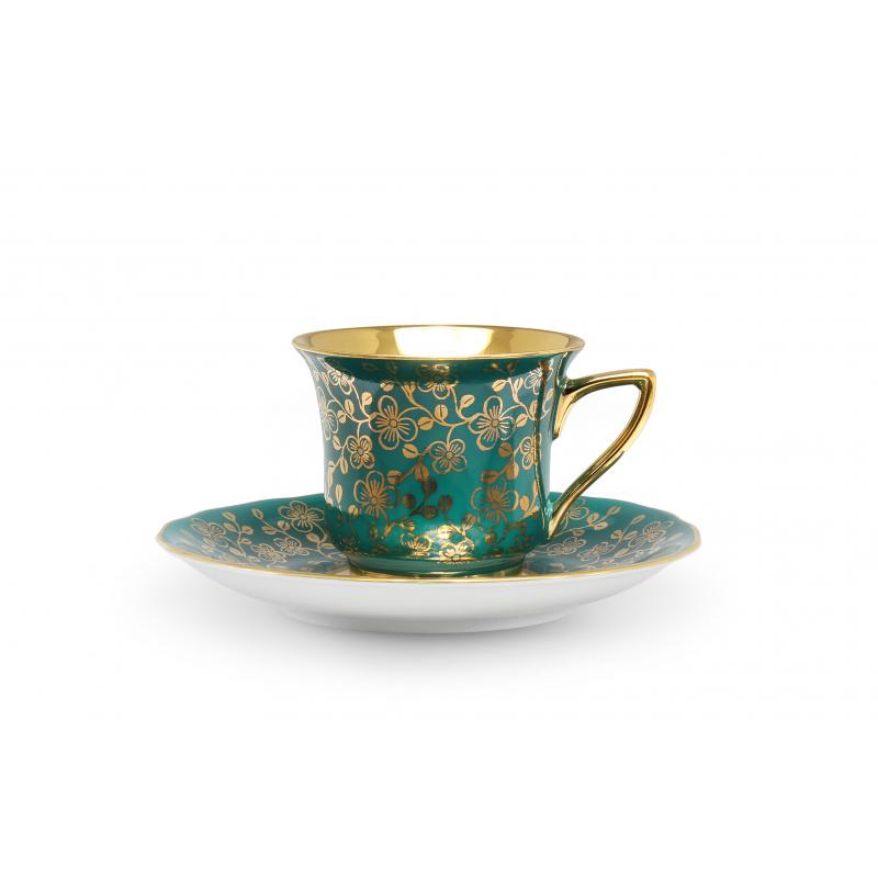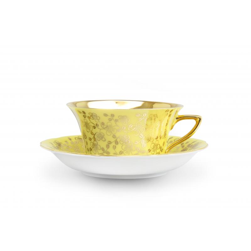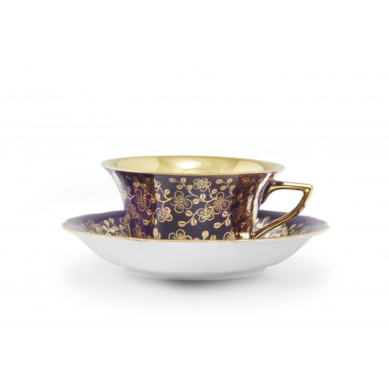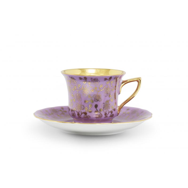 Celozlacený vnitřek šálku a zlatá razítka s velkými květy v kombinaci s pastelovými barvami dávají soupravě neobyčejný vzhled.